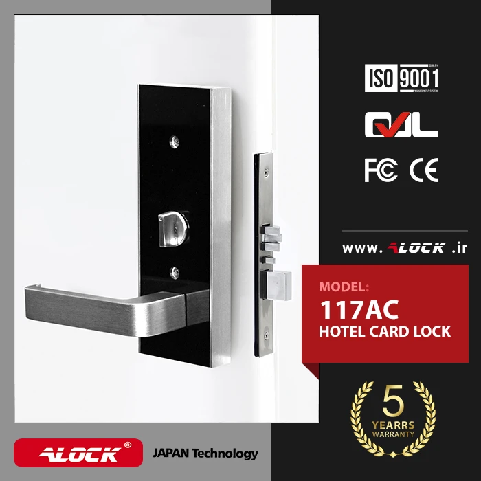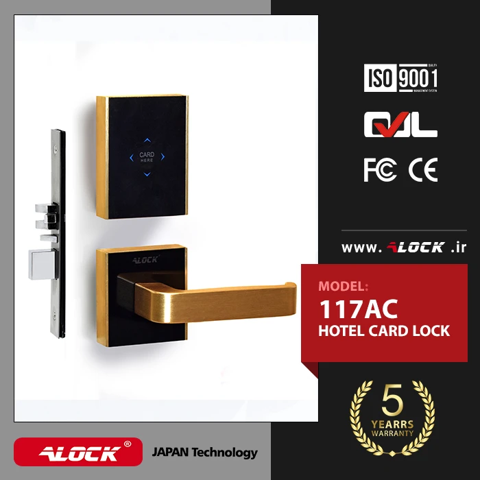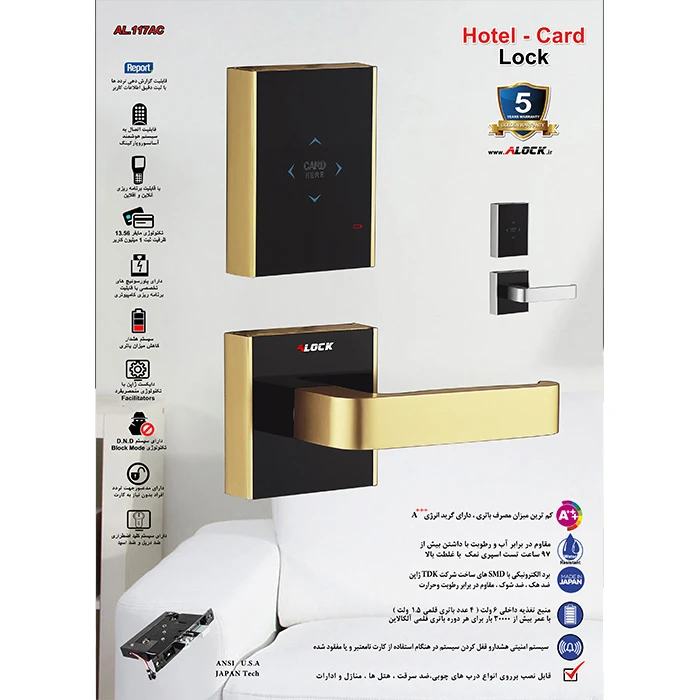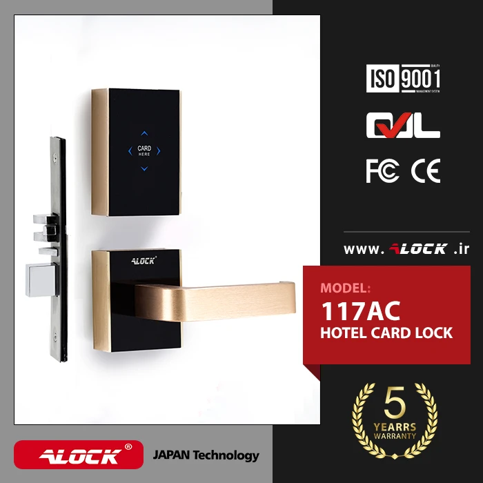 دستگیره دو تکه هتلی ALOCK مدل 117AC در گروه هتلی ها جزو پر فروش ترین های مدرن می باشد . این دستگیره با قطعات ساخت ژاپن تولید شده است . بدنه محصول دارای مادا مالعمر گارانتی رنگ می باشد .این محصول دارای رنگ های مختلف با قابلیت سفارشی سازی توسط خریدار را دارا میباشد . تکنولوژی برد این محصول از نوع مایفر Mifare 13.56 Mhz می باشد . بدنه این دستگیره از جنس آلومینیوم ساخته شده است .بدنه بسیار مستحکم و با متریال فلزی مناسب ، و نوع دایکست به کار رفته در ساخت این محصول ، سبب افزایش قدرت و استحکام آن در بازه زمانی طولانی شده است .