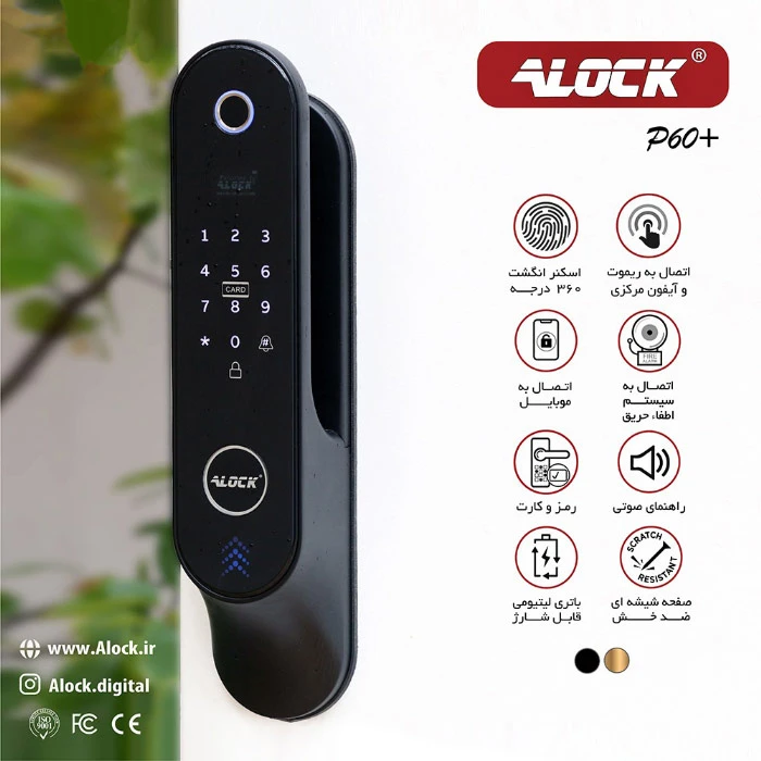 قفل دیجیتال +P60 یکی دیگر از قفل های اثر انگشتی تولید شده توسط شرکت ALOCK می باشد. قفل دیجیتال +P60 بر اساس آناتومی بدن و مطابق بر طراحی ها و نیاز روز بازار تولید شده است. اسکنر اثرانگشت این دستگاه از نوع بیومتریک 360 درجه می باشد. نرم افزار ارتباط آنلاین این محصول نرم افزار بسیار محبوب Tuya می باشد که به کاربران امکان اتصال قفل به سیستم های خانه هوشمند و کنترل بر روی نرم افزار های جانبی Tuya را می دهد. این محصول دارای بدنه بسیار قدرتمند و موتور بزرگ طرح Zanetti ایتالیا می باشد. دستگیره هوشمند +P60 دارای ریموت کنترل بوده که به کاربرانی در محیط های اداری بسیار کمک خواهد کرد تا قفل را از فاصله تقریبی 30 متر بتوانند باز کنند. قفل بدنه این محصول از فولاد آلیاژی ضد زنگ و کاملا اتومات طراحی شده به گونه ای که پس از بسته شدن درب، زبانه های قفل بصورت اتومات و هوشمند بسته خواهند شد. البته قابلیت قفل کردن دستی نیز با لمس یک دکمه برای این محصول پیش بینی شده است. این دستگره دارای کلید لمسی زنگ بوده که برای اعلان حضور افراد مقابل درب می توان از آن استفاده کرد. دسیبل شنیداری این زنگ در بازه 50 بوده که خریداران را از استفاده از زنگ های جانبی بی نیاز می کند. نیاز کشور و پروژه های مسکونی و اداری به امنیت با تکنولوژی های به روز سبب طراحی های خاص در صنعت قفل های الکترونیکی ALOCK شده است.