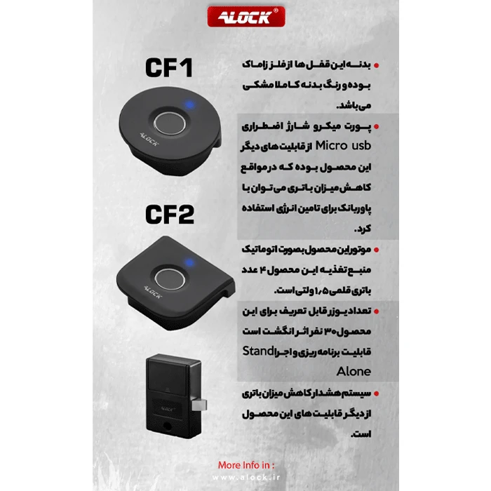 قفل کمدی هوشمند اثر انگشتی ALOCK مدل CF1 یک محصول خاص با کیفیت بسیار بالا می باشد. بدنه این قفل از فلز زاماک بوده و رنگ بدنه کاملا مشکی می باشد. برخلاف تمامی برندهای موجود در بازار که از بدنه و پنل پلاستیک استفاده میکنند، بدنه این قفل اثر انگشتی کابینتی از فلز و موتور این محصول بصورت اتوماتیک می باشد. کاربرد این محصول برای درب های کمدی طلا و جواهر، مدارک، کلکسیون ساعت، اداری پرسنلی و ... می باشد. منبع تغذیه این محصول 3 عدد باتری قلمی 1.5 ولتی می باشد. پورت میکرو شارژ اضطراری Micro USB از قابلیت های دیگر این محصول بوده که در مواقع کاهش میزان باتری میتوان از پاور بانک برای تامین انرژی استفاده کرد. تعداد یوزر قابل تعریف برای این محصول 30 نفر اثر انگشت می باشد. این قفل کمدی هوشمند نیازی به استفاده از نرم افزار نداشته و بصورت Stand Alone قابلیت برنامه ریزی و اجرا دارد. سیستم هشدار کاهش میزان باتری از دیگر قابلیت های این محصول می باشد.